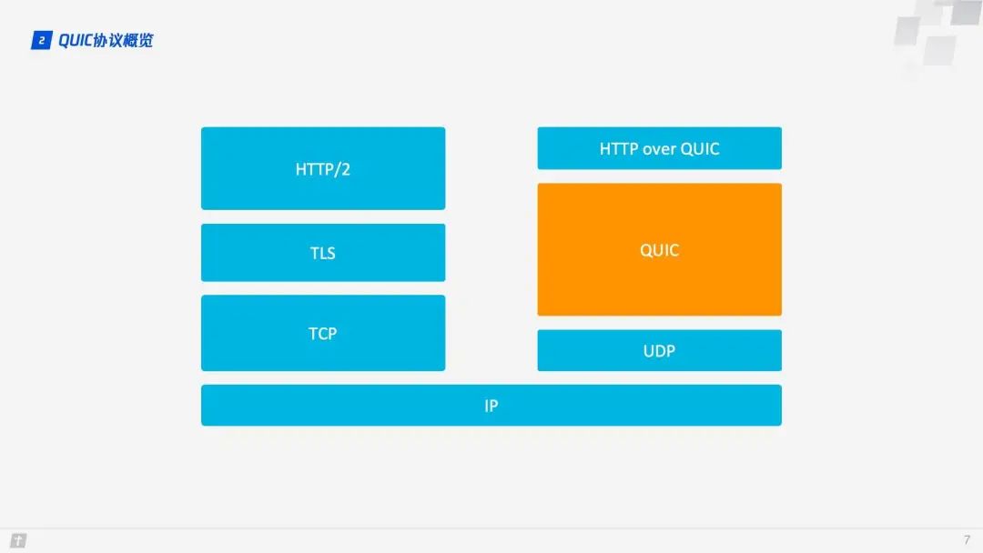 随着网络技术的发展,1999 年设计的 HTTP/1.1 已经不能满足需求,所以 Google 在 2009 年设计了基于 TCP 的 SPDY,后来 SPDY 的开发组推动 SPDY 成为正式标准,不过最终没能通过。不过 SPDY 的开发组全程参与了 HTTP/2 的制定过程,参考了 SPDY 的很多设计,所以我们一般认为 SPDY 就是 HTTP/2 的前身。无论 SPDY 还是 HTTP/2,都是基于 TCP 的,TCP 与 UDP 相比效率上存在天然的劣势,所以 2013 年 Google 开发了基于 UDP 的名为 QUIC 的传输层协议,QUIC 全称 Quick UDP Internet Connections,希望它能替代 TCP,使得网页传输更加高效。后经提议,互联网工程任务组正式将基于 QUIC 协议的 HTTP (HTTP over QUIC)重命名为 HTTP/3。 1.2 QUIC 协议概览 TCP 一直是传输层中举足轻重的协议,而 UDP 则默默无闻,在面试中问到 TCP 和 UDP 的区别时,有关 UDP 的回答常常寥寥几语,长期以来 UDP 给人的印象就是一个很快但不可靠的传输层协议。但有时候从另一个角度看,缺点可能也是优点。QUIC(Quick UDP Internet Connections,快速 UDP 网络连接) 基于 UDP,正是看中了 UDP 的速度与效率。同时 QUIC 也整合了 TCP、TLS 和 HTTP/2 的优点,并加以优化。用一张图可以清晰地表示他们之间的关系。