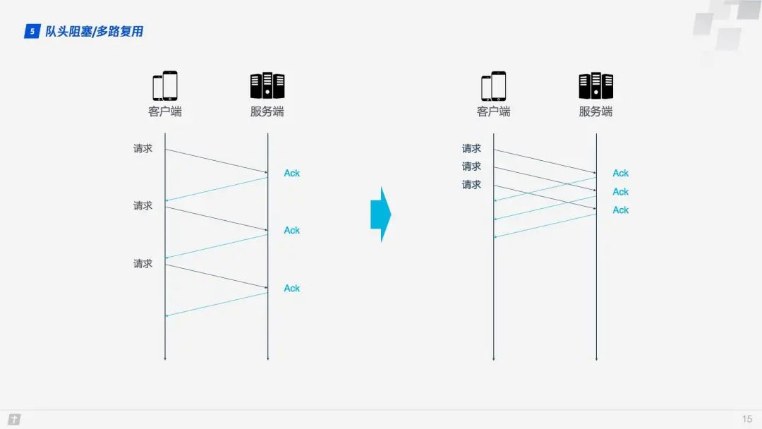 1.5 队头阻塞/多路复用 HTTP/1.1 和 HTTP/2 都存在队头阻塞问题(Head of line blocking),那什么是队头阻塞呢? TCP 是个面向连接的协议,即发送请求后需要收到 ACK 消息,以确认对方已接收到数据。如果每次请求都要在收到上次请求的 ACK 消息后再请求,那么效率无疑很低。后来 HTTP/1.1 提出了 Pipelining 技术,允许一个 TCP 连接同时发送多个请求,这样就大大提升了传输效率。