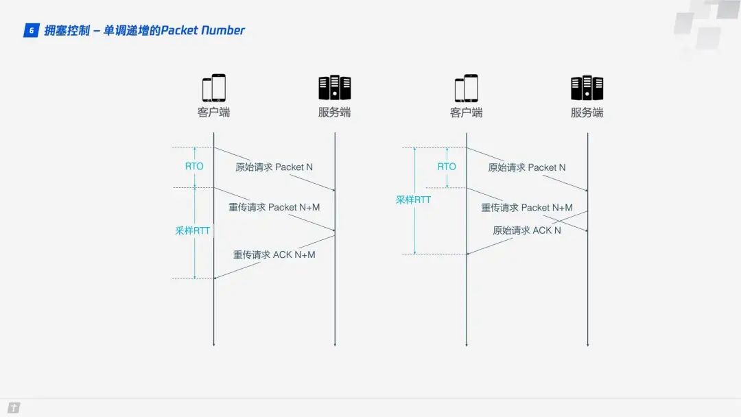QUIC 解决了上面的歧义问题。与 Sequence Number 不同的是,Packet Number 严格单调递增,如果 Packet N 丢失了,那么重传时 Packet 的标识不会是 N,而是比 N 大的数字,比如 N + M,这样发送方接收到确认消息时就能方便地知道 ACK 对应的是原始请求还是重传请求。