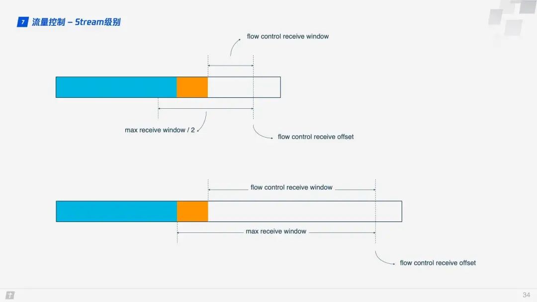 1.7 流量控制 TCP 会对每个 TCP 连接进行流量控制,流量控制的意思是让发送方不要发送太快,要让接收方来得及接收,不然会导致数据溢出而丢失,TCP 的流量控制主要通过滑动窗口来实现的。可以看出,拥塞控制主要是控制发送方的发送策略,但没有考虑到接收方的接收能力,流量控制是对这部分能力的补齐。 QUIC 只需要建立一条连接,在这条连接上同时传输多条 Stream,好比有一条道路,两头分别有一个仓库,道路中有很多车辆运送物资。QUIC 的流量控制有两个级别:连接级别(Connection Level)和 Stream 级别(Stream Level),好比既要控制这条路的总流量,不要一下子很多车辆涌进来,货物来不及处理,也不能一个车辆一下子运送很多货物,这样货物也来不及处理。 那 QUIC 是怎么实现流量控制的呢?我们先看单条 Stream 的流量控制。Stream 还没传输数据时,接收窗口(flow control receive window)就是最大接收窗口(flow control receive window),随着接收方接收到数据后,接收窗口不断缩小。在接收到的数据中,有的数据已被处理,而有的数据还没来得及被处理。如下图所示,蓝色块表示已处理数据,黄色块表示未处理数据,这部分数据的到来,使得 Stream 的接收窗口缩小。