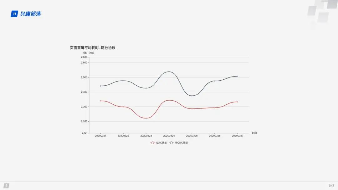 使用 QUIC 协议时页面首屏耗时要比非 QUIC 协议减少 10%。