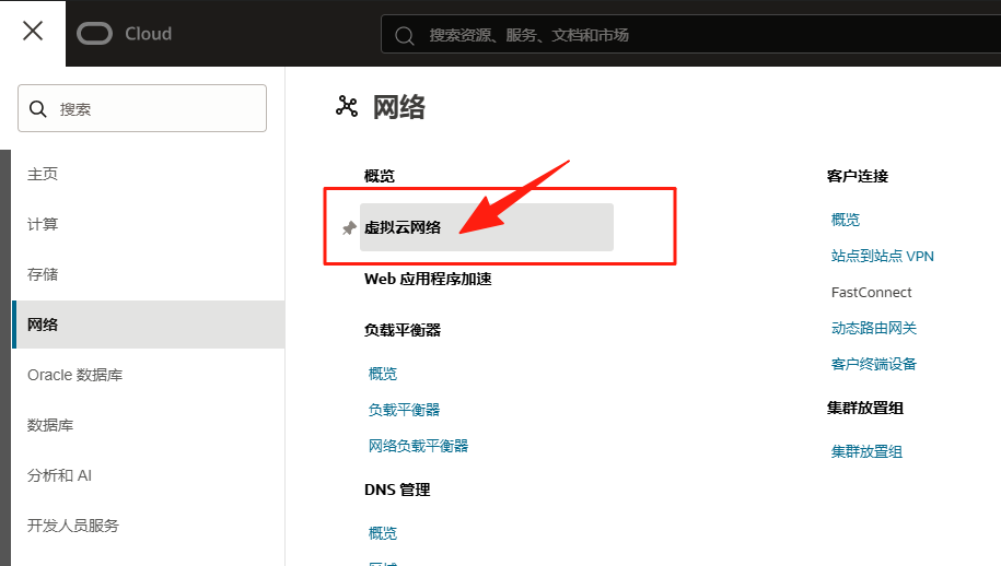 选择目标 VCN。如图所示,选择刚创建的VCN,点击进入详情页面。