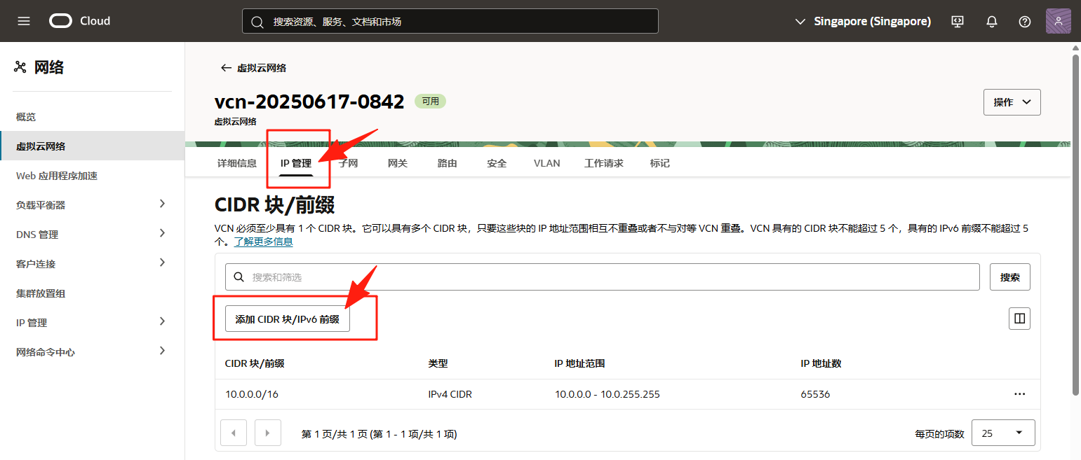 在 VCN 详情页面,导航到IP管理–>找到 CIDR 块 /前缀 部分。