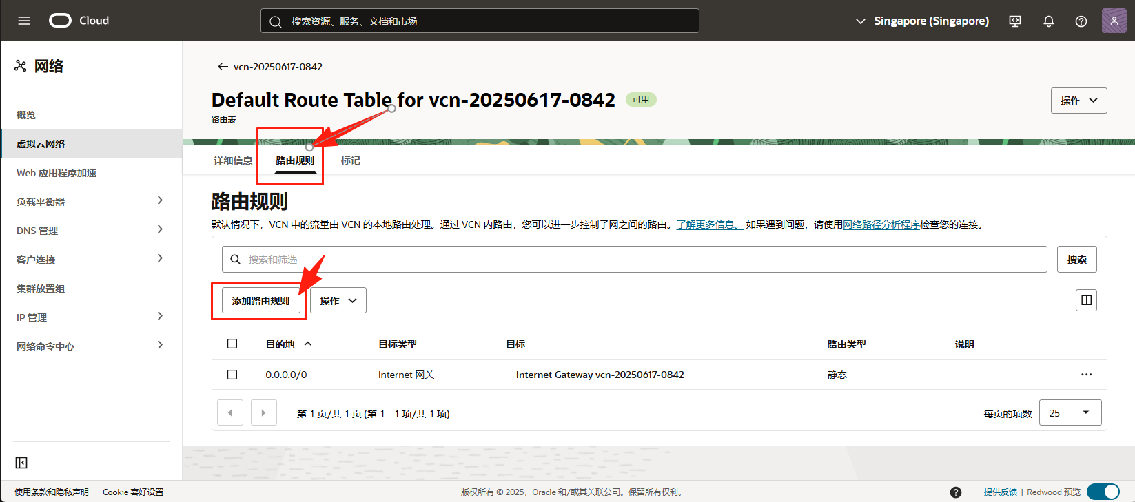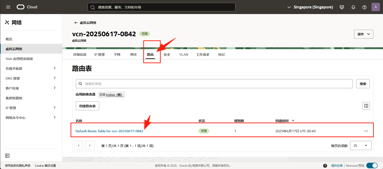 三、配置路由表以允许 IPv6 互联网访问 需要为子网关联的路由表添加一条规则,将所有目标为外部 IPv6 地址的流量(::/0)指向互联网网关。 在 VCN 详情页面,点击菜单中的 路由,选择子网默认关联的那个路由表,进入路由详情页面。