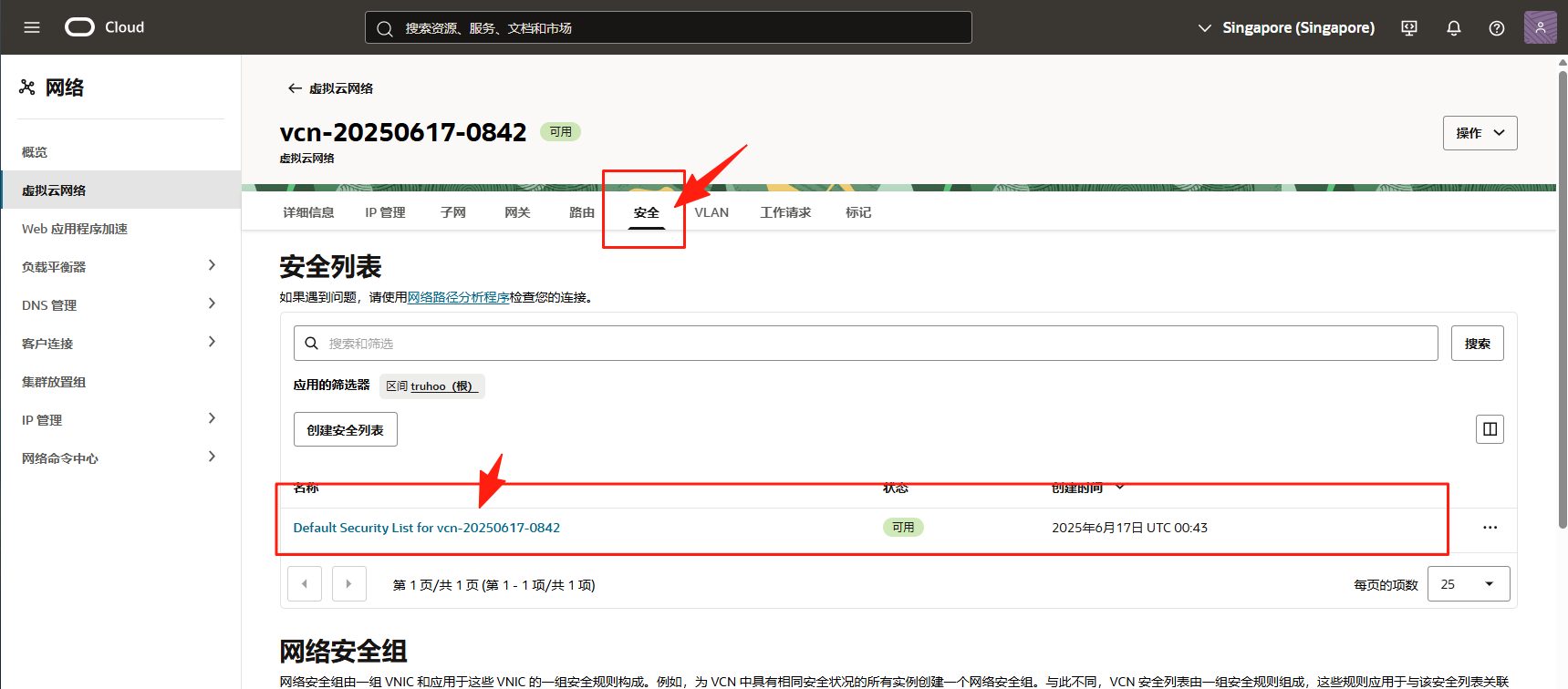 四、配置安全规则允许 IPv6 流量 需要更新与实例 VNIC 关联的安全列表 (Security List) 或添加了网络安全组 (Network Security Group, NSG)。默认使用的防火墙类型是安全列表,如果你添加了网络安全组也要添加对应的规则。 在 VCN 详情页面,点击菜单中的 安全,如图选择默认的安全列表。