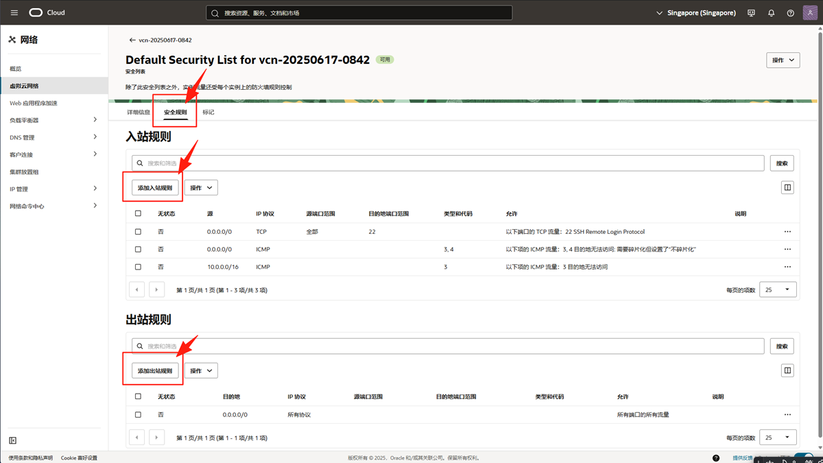 切换到安全规则,这里可以添加入站 (Ingress) 和出站 (Egress) 规则。