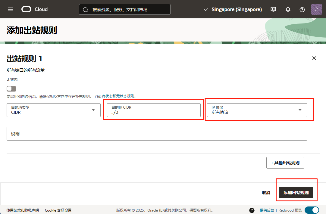 只需要添加必要的 IPv6 流量即可,通常默认允许所有出站协议。下滑点击添加出战规则: 放行所有出站 IPv6 流量(服务器才能使用IPv6上网),目的地类型: CIDR, 目的地CIDR::/0, IP协议所有协议,最后添加出站规则。