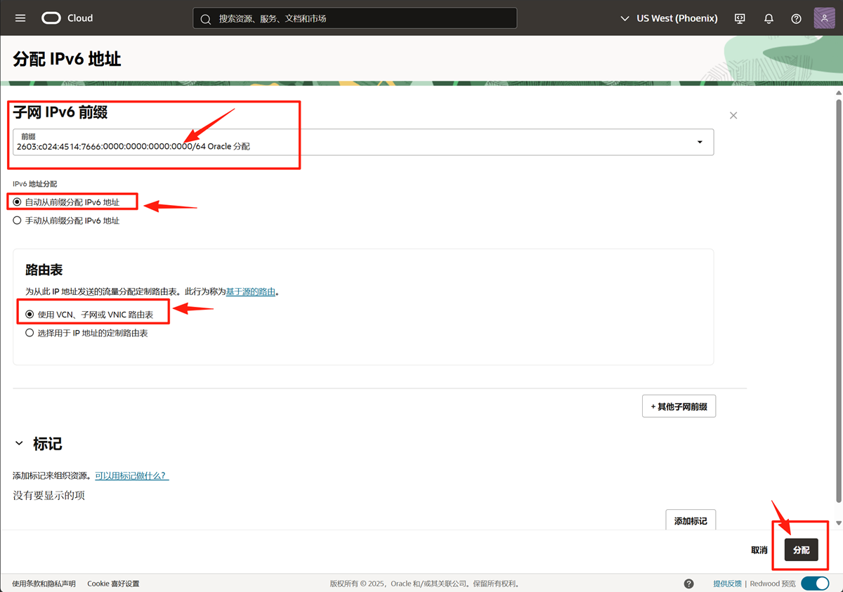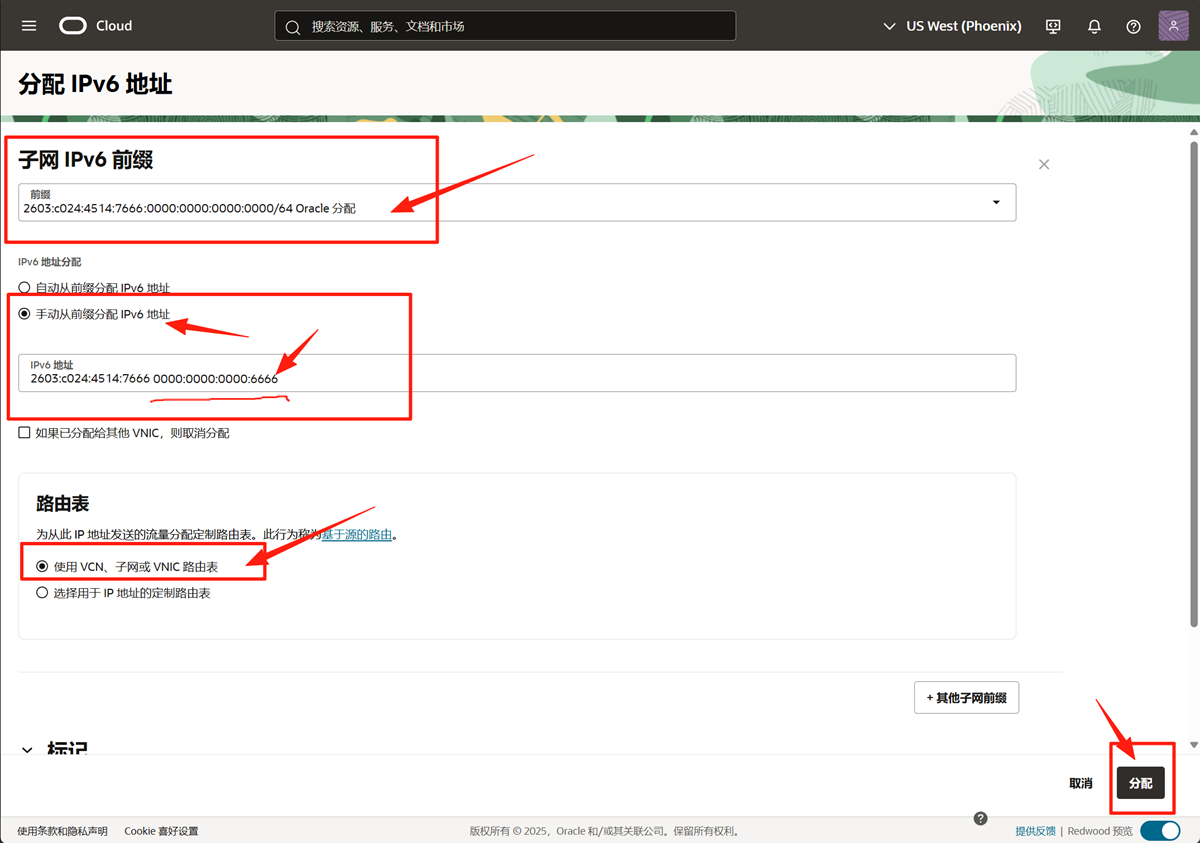 进入添加IPv6前缀页面,勾选分配 Oracle 分配的 IPv6 /64 前缀,在 Oracle分配的IPv6地址 字段,输入两个十六进制字符 (00-FF),如我这边我输入的【66】 ,点击右下角 添加IPv6前缀。
