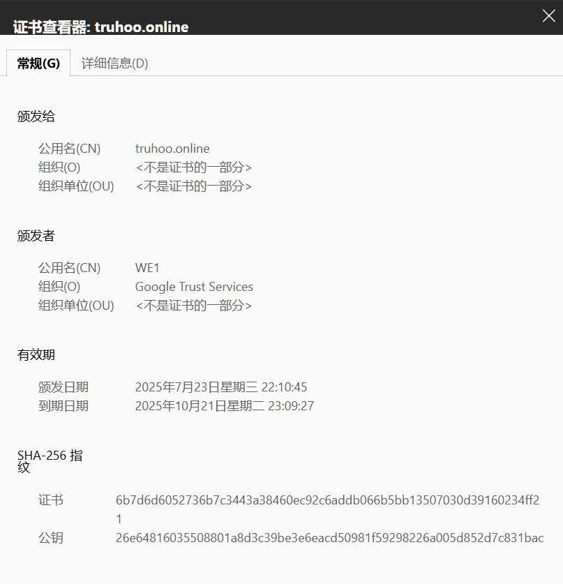 SSL 证书包含的重要信息 要查看 SSL 证书的详细信息,可以单击浏览器地址栏中的锁图标。常见的 SSL 证书信息包括: 1、颁发证书的域名(Common Name): 这是证书所属的域名,通常是访问的网站的域名。证书是专门为这个域名颁发的。 2、持有人信息(Subject): 证书持有人的名称、组织或设备信息。这可以是个人、公司或其他实体。 3、证书颁发机构(Certificate Authority,CA): 颁发证书的受信任机构的名称,证明了证书的合法性。 4、CA 的数字签名(CA Signature): 用于验证证书真实性的数字签名,确保证书未被篡改。 5、关联的子域(Subject Alternative Names,SANs): 如果证书用于保护多个域名或子域,这里会列出所有相关的域名。 6、证书颁发日期(Valid From): 证书的有效期开始日期,标志着证书的生效时间。 7、证书到期日期(Valid To): 证书的有效期结束日期,之后证书将不再被视为有效。 8、公钥(Public Key): 证书中包含的公钥,用于建立安全的通信连接。请注意,私钥不会包含在证书中,它是服务器独有的。 9、SSL/TLS 版本: 证书支持的 SSL/TLS 协议版本。现代证书通常使用 TLS,但有时安全专家仍使用 "SSL/TLS" 缩写来表示这种协议。